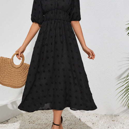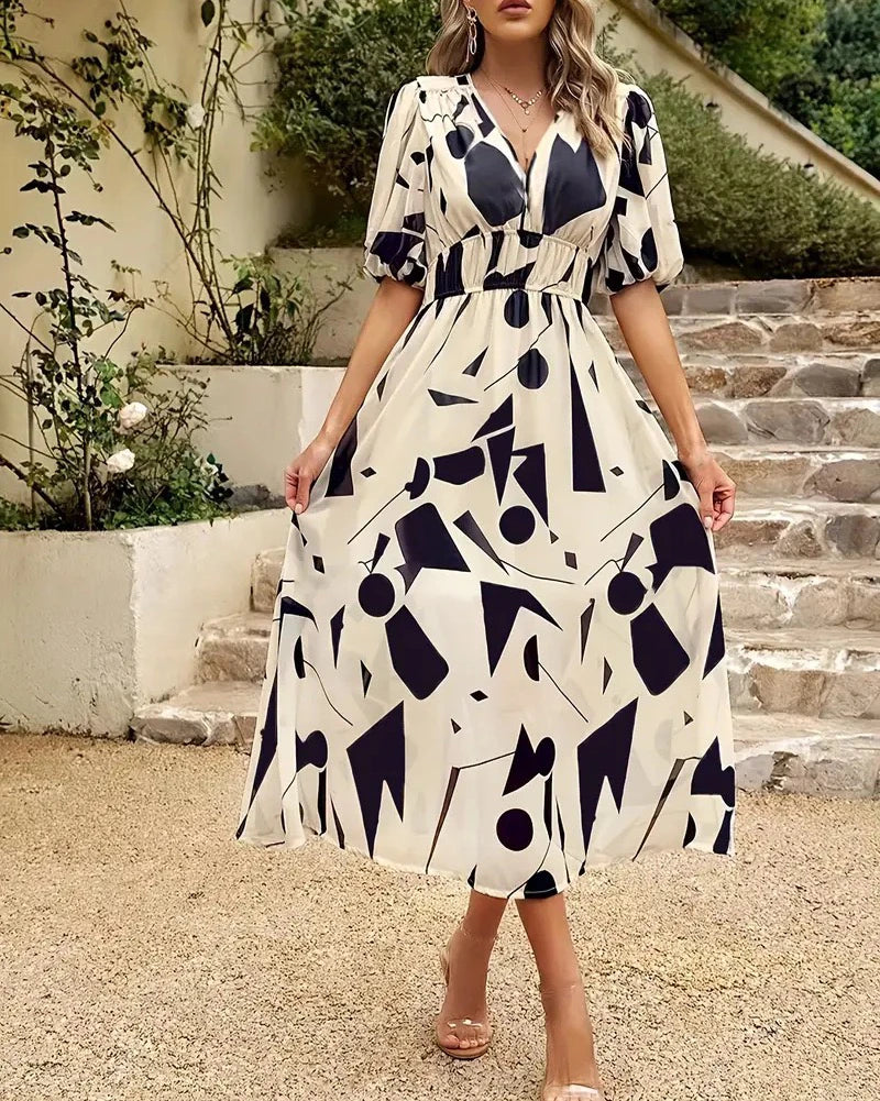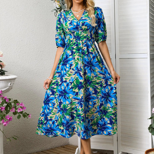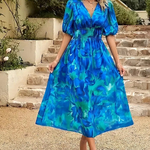 New Boho Floral Print Midi Dress Women Fashion V-neck Short Sleeve Dresses For Women 2025 Summer Casual Holiday Long Dress