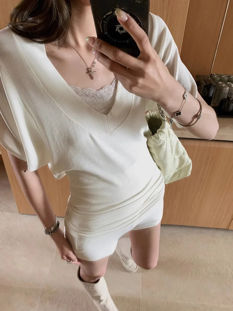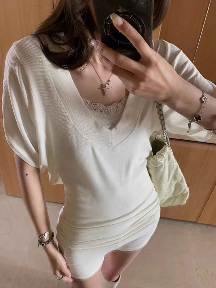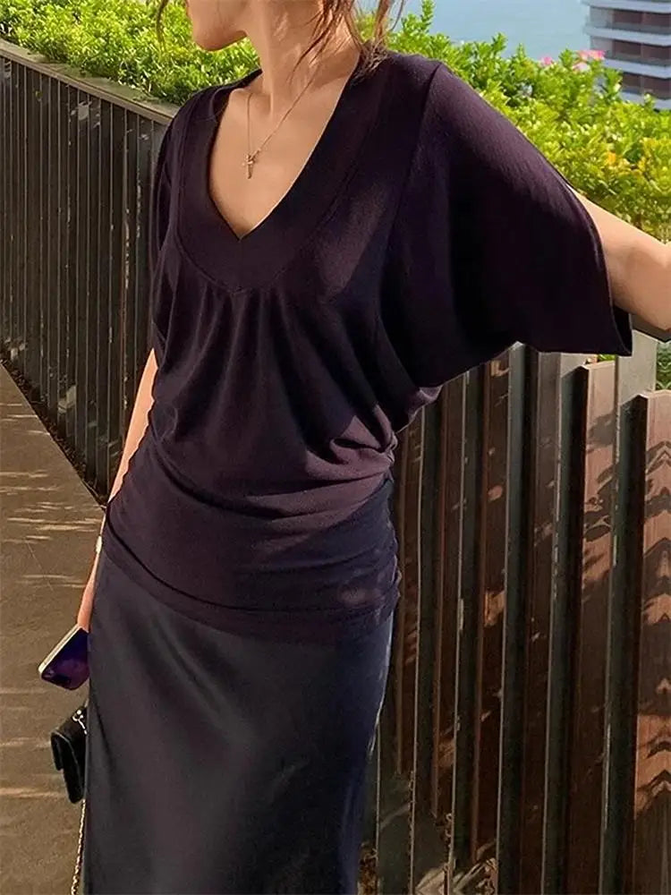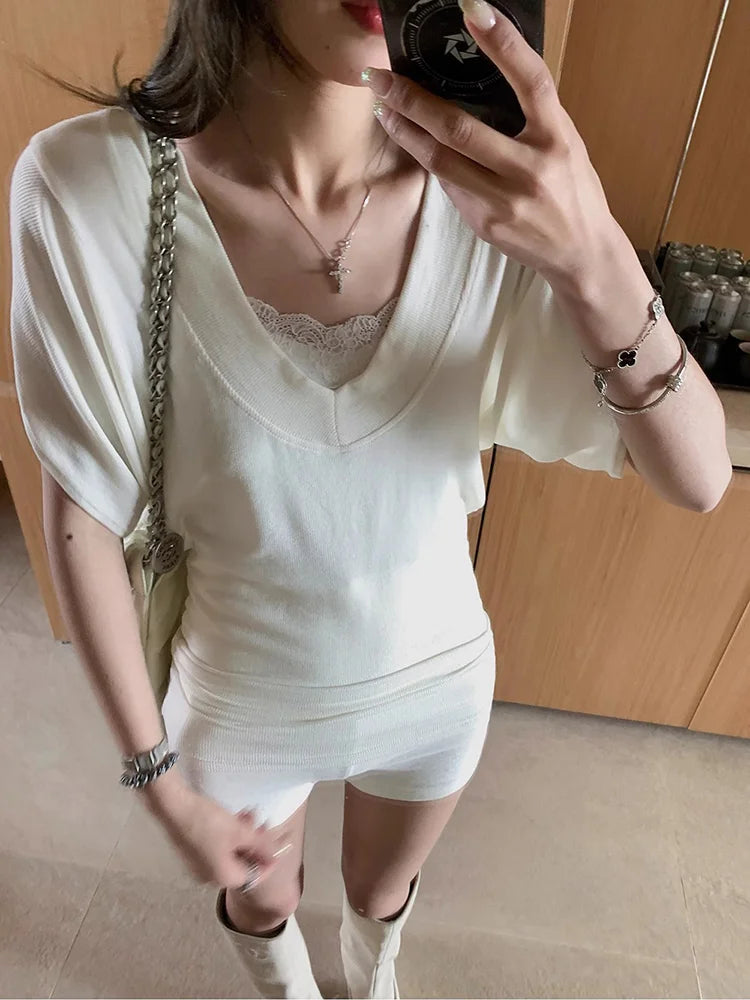 Ribbed Tops Loose V-neck Short Sleeve T-shirt for Woman Summer New Simple Basic Top Design Bat Sleeve T-shirt Casual Y2k Clothes