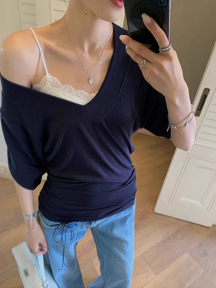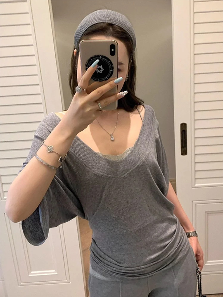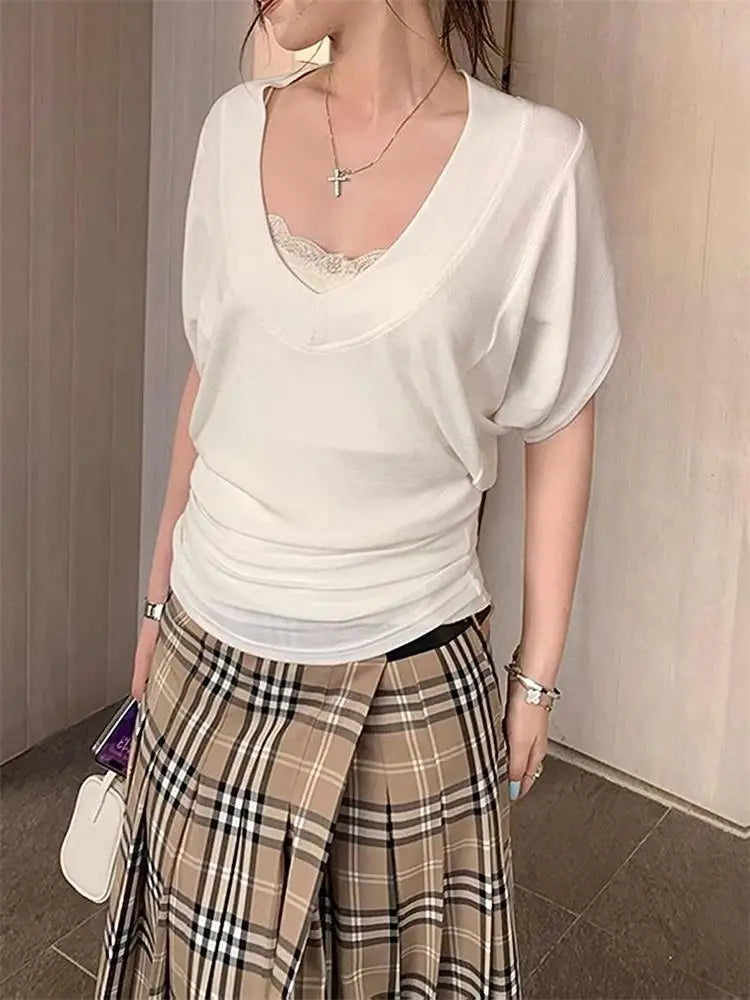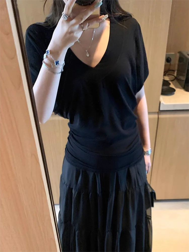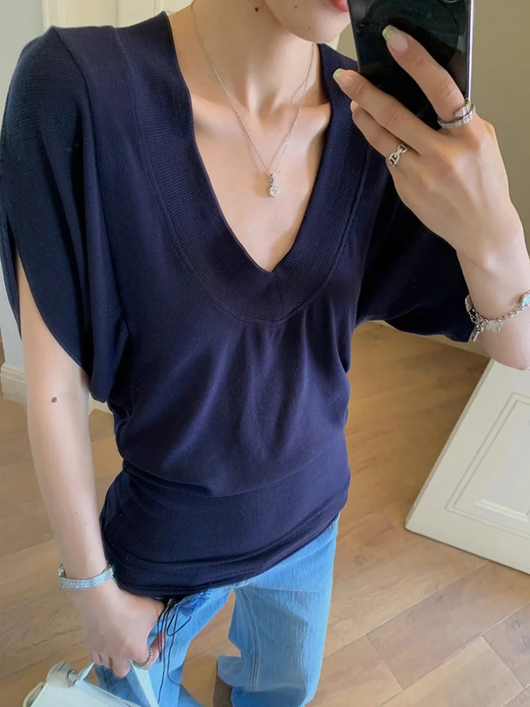 Ribbed Tops Loose V-neck Short Sleeve T-shirt for Woman Summer New Simple Basic Top Design Bat Sleeve T-shirt Casual Y2k Clothes