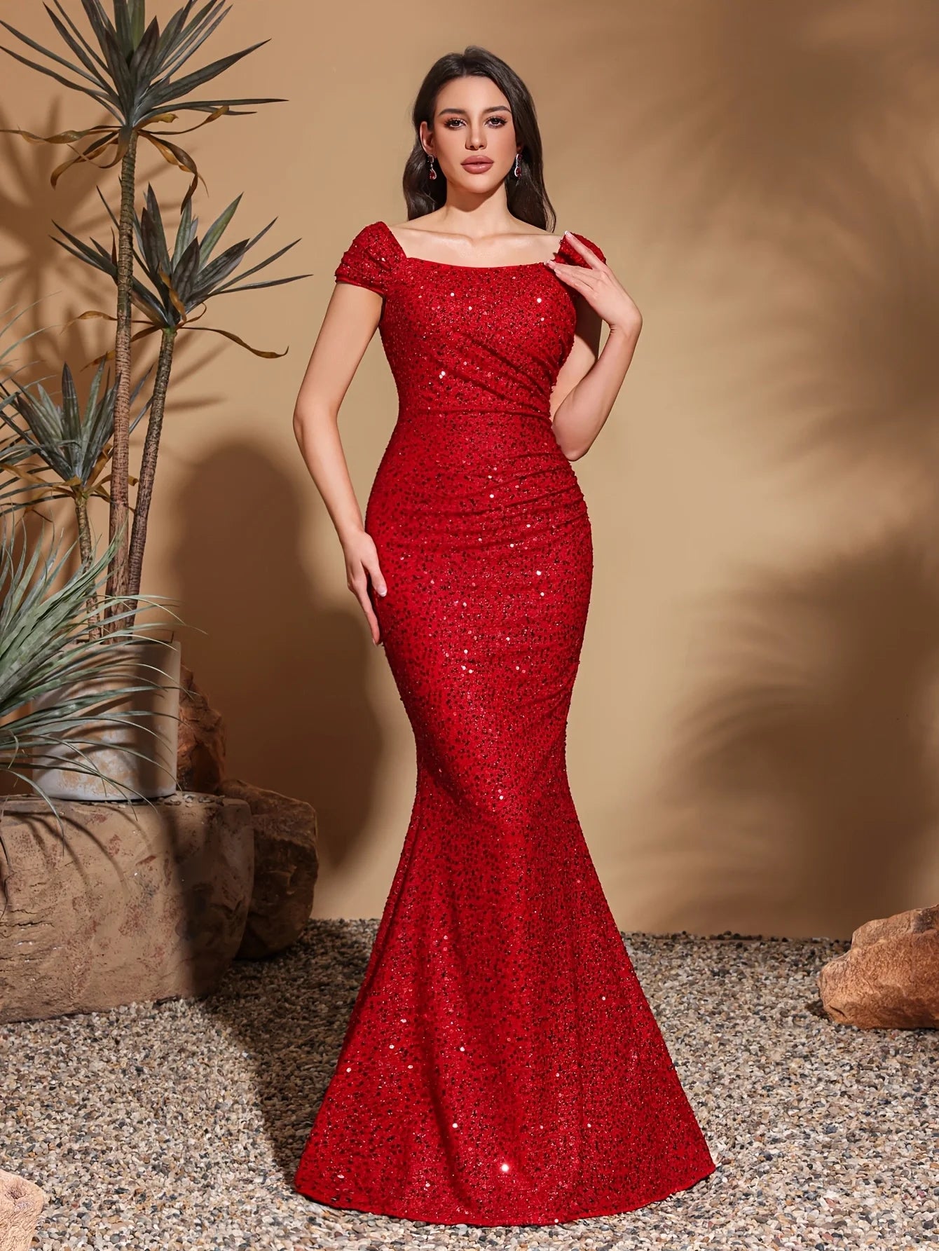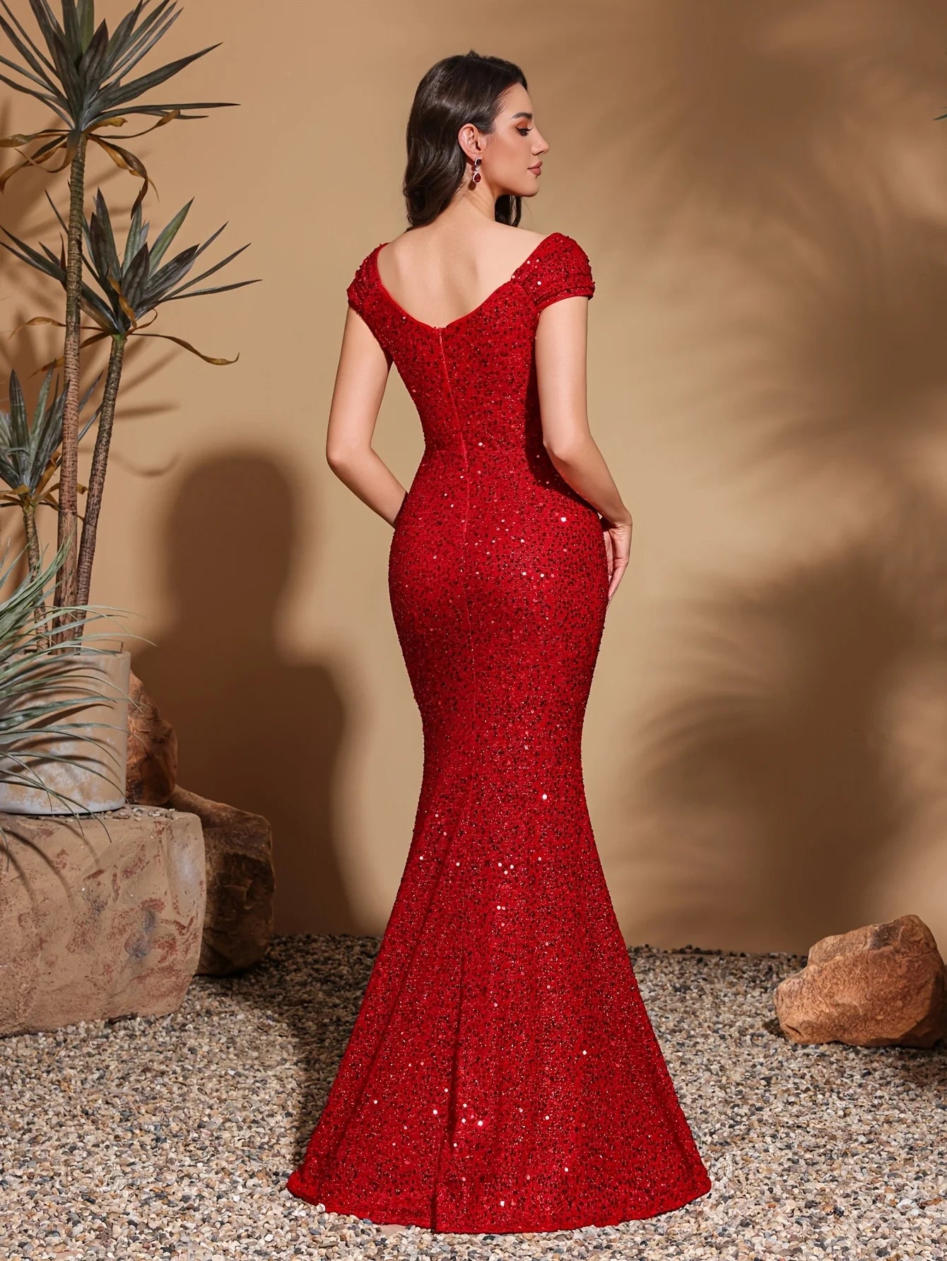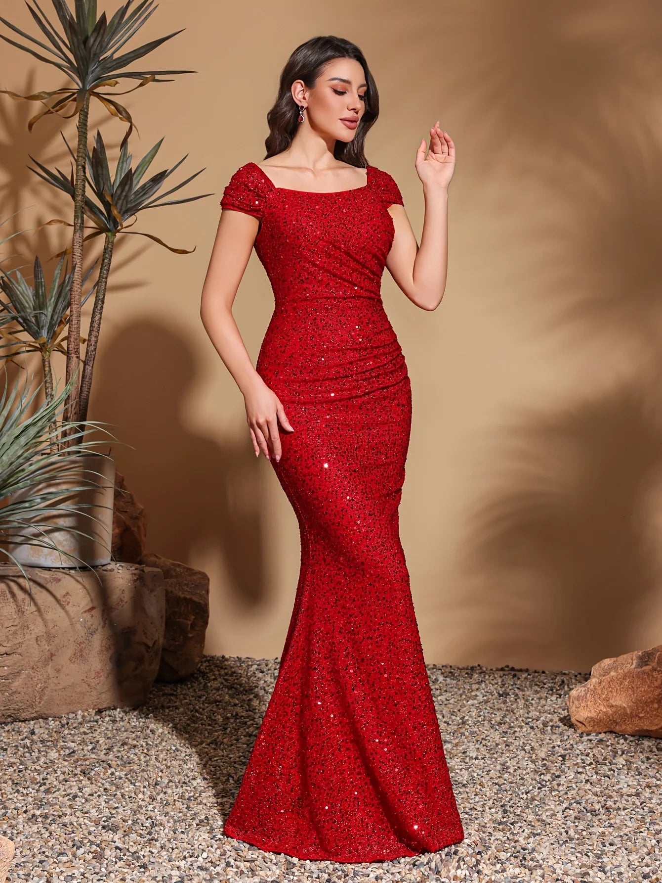 Simple and elegant square neck sequined hip party dress skirt, elegant and chic dress