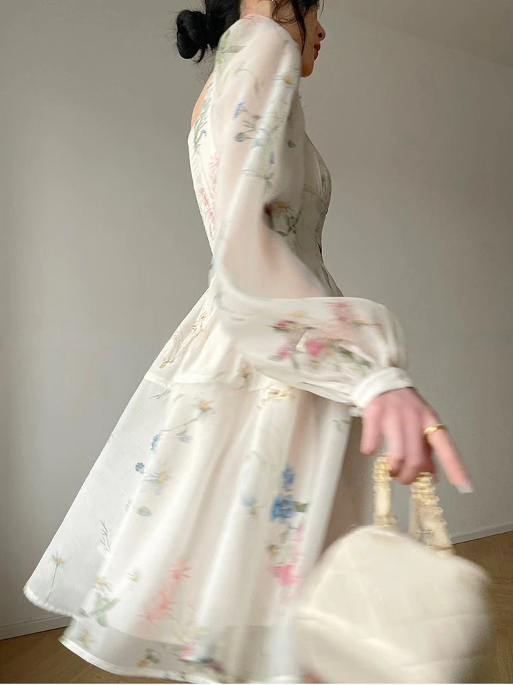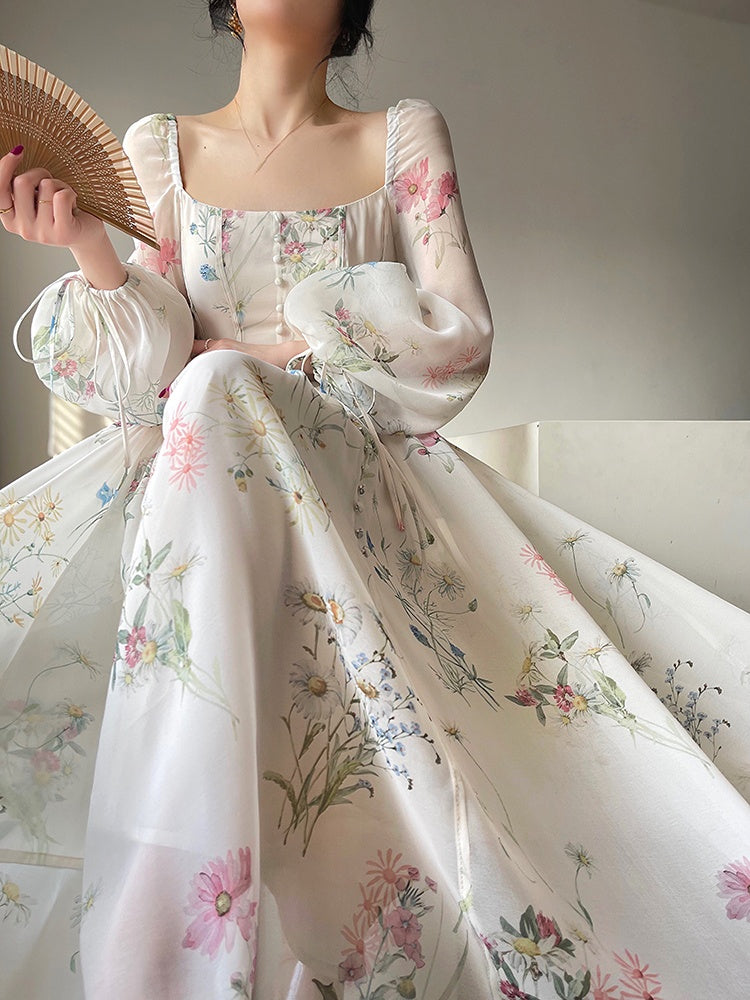 Vintage Floral Midi Dress Women Elegant Party Square Collar Dresses Summer Beach Fairy Korean Long Sleeve Bodycon Vestidos New